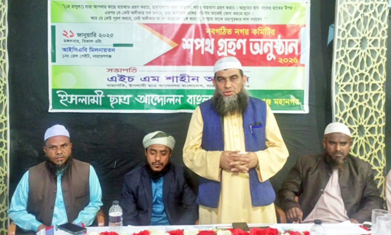 ২১ জানুয়ারি ২০২৫ মঙ্গলবার সন্ধ্যায় দলীয় কার্যালয়ে ইসলামী ছাত্র আন্দোলন বাংলাদেশ নারায়ণগঞ্জ মহানগর এর নবগঠিত কমিটির শপথ গ্রহণ অনুষ্ঠান ২০২৫-এ এইচ এম শাহীন আদনান এর সভাপতিত্বে প্রধান অতিথির বক্তব্যে ইসলামী আন্দোলন বাংলাদেশ নারায়ণগঞ্জ মহানগর এর সভাপতি জননেতা মুফতী মাসুম বিল্লাহ বলেন, একটি রাষ্ট্র গঠনের জন্য ছাত্র সমাজ জাগ্রত হলে কি হতে পারে তা আমরা ২৪ এর জুলাই গণ-অভ্যুত্থানে স্ব-চক্ষে দেখেছি,তাই আমি বলবো আগামীর নারায়ণগঞ্জ কে কল্যাণ নগরী,কিশোরগ্যাং মুক্ত, সন্ত্রাস মুক্ত নগরী গঠন করতে আদর্শের দাওয়াতের মাধ্যমে ছাত্রদের মধ্যে সচেতনতা বৃদ্ধির করে আপনাদের বিশেষ ভুমিকা রাখতে হবে।