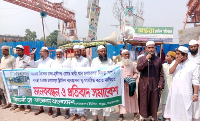 ঢাকা-মুন্সীগঞ্জ সড়কে তীব্র যানজট নিরসন, ভারী যানবাহন চলাচলের জন্য বিকল্প পথের ব্যবস্থা এবং নির্মাণকাজ চলাকালীন সময়ে সু-সংগঠিত ট্রাফিক ব্যবস্থাপনার দাবিতে ইসলামী যুব আন্দোলন বাংলাদেশ, এনায়েতনগর ইউনিয়ন শাখার উদ্যোগে এক মানববন্ধন ও প্রতিবাদ সমাবেশ অনুষ্ঠিত হয়েছে।