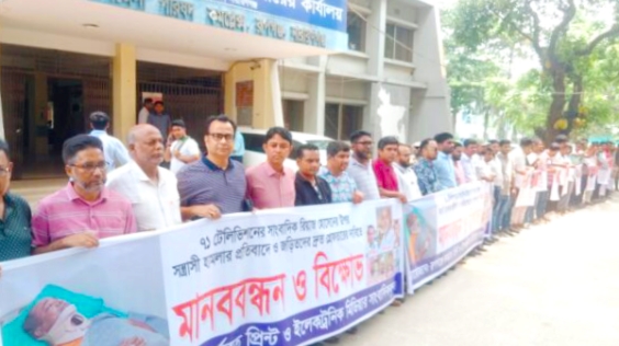 রূপগঞ্জে ৭১ টেলিভিশনের সাংবাদিক রিয়াজ হোসেনের উপর সন্ত্রাসী হামলার প্রতিবাদে মানববন্ধন ও বিক্ষোভ