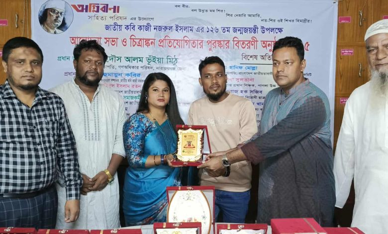 নিজস্ব প্রতিবেদক : বিদ্রোহী কবি কাজী নজরুল ইসলাম এর ১২৬ তম জন্মজয়ন্তী উপলক্ষে অগ্নিবীণা সাহিত্য পরিষদ এর উদ্যোগে আলোচনা সভা ও চিত্রাঙ্কন প্রতিযোগিতার পুরস্কার বিতরণী অনুষ্ঠান অনুষ্ঠিত হয়েছে।