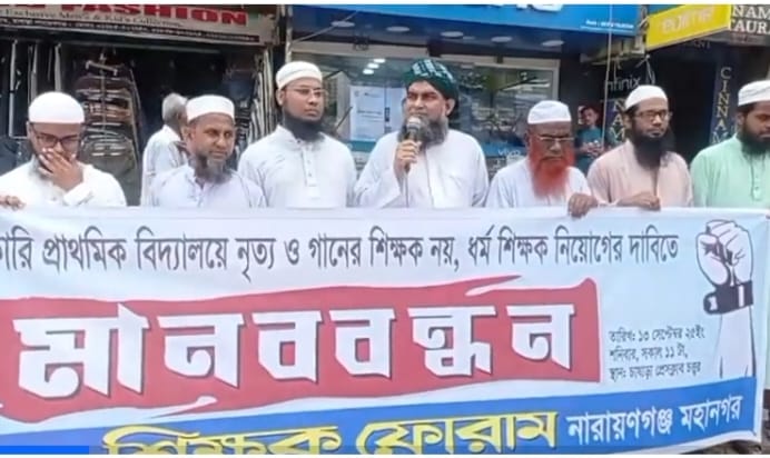 বিকেল ৫টায় জাতীয় শিক্ষক ফোরাম নারায়ণগঞ্জ মহানগরের উদ্যোগে সরকারি প্রাথমিক বিদ্যালয়গুলোতে নৃত্য ও গানের শিক্ষকের পরিবর্তে ধর্ম শিক্ষক নিয়োগের দাবিতে মানববন্ধনে প্রধান অতিথির বক্তব্যে তিনি এসব কথা বলেন। শিক্ষক ফোরাম নগর সভাপতি আলতাফ হোসেনের সভাপতিত্বে সাধারণ সম্পাদক মোঃ আমির হোসাইন এর সঞ্চালনায় বিভিন্ন স্কুলের শিক্ষকবৃন্দ উপস্থিত ছিলেন।
