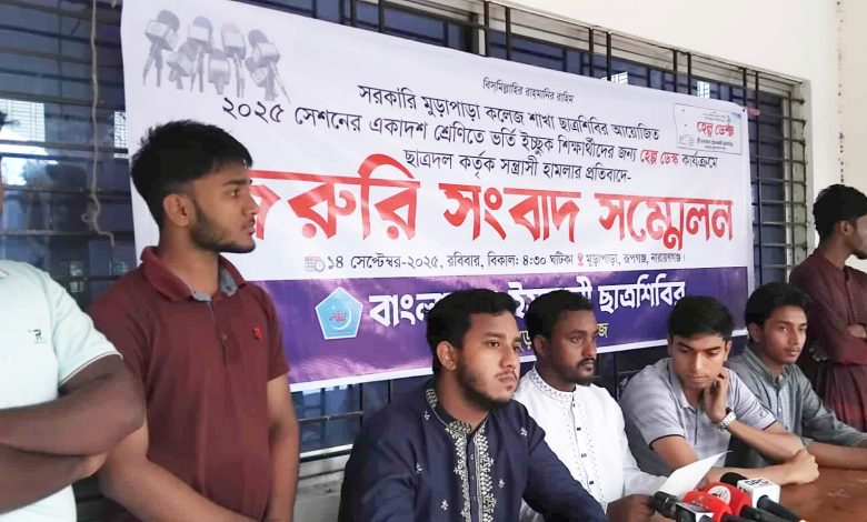 সরকারি মুড়াপাড় কলেজে ইসলামী ছাত্রশিবিরের হেল্প ডেস্কে সন্ত্রাসী হামলার প্রতিবাদ ও বিচার দাবী