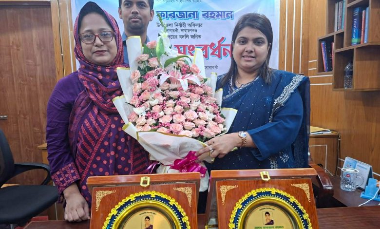 সোনারগাঁ উপজেলা ভূমি কর্মকর্তাদের আয়োজনে মঙ্গলবার দুপুরে এ সংবর্ধনা প্রদান করা হয়।এ সময় সহকারী কমিশনার (ভূমি) তৌফিকুর রহমান ও ফাইরুজ তাসনীম বিদায়ী ইউএনওকে ফুলেল শুভেচ্ছা জানান।