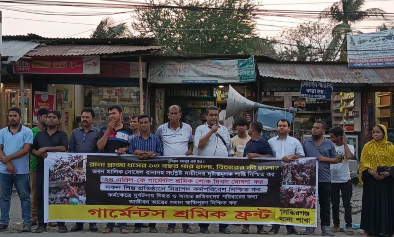 রানা প্লাজা ধসের ১৩ বছর পূর্তি উপলক্ষে শ্রমিকদের নিরাপত্তা, ন্যায্য ক্ষতিপূরণ ও দায়ীদের দৃষ্টান্তমূলক শাস্তির দাবিতে রবিবার ১৯ এপ্রিল বিকাল ৫টায় নারায়ণগঞ্জের সিদ্ধিরগঞ্জ থানার গোদনাইল চৌধুরী বাড়ী বাসস্ট্যান্ডে গার্মেন্টস শ্রমিক ফ্রন্ট সিদ্ধিরগঞ্জ থানা শাখার উদ্যোগে মানববন্ধন ও মিছিল অনুষ্ঠিত হয়।