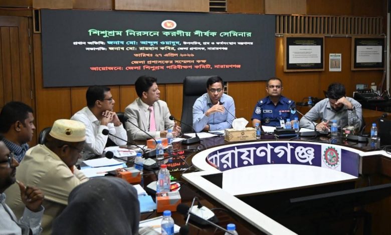 খবর নারায়ণগঞ্জ.কম:শিশুশ্রম নিরসন ও শিশু অধিকার সুরক্ষার লক্ষ্যে নারায়ণগঞ্জে ‘শিশুশ্রম নিরসনে করণীয়’ শীর্ষক সেমিনার অনুষ্ঠিত হয়েছে। সোমবার, ২৭ এপ্রিল জেলা প্রশাসকের কার্যালয়ের সম্মেলন কক্ষে এ সেমিনার অনুষ্ঠিত হয়।